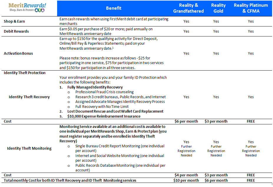1 Refer to MeritRewards Program Description for full details of the program. MeritRewards Shop, Earn & Protect: The Identity Theft Protection services mentioned above are provided through an arrangement with NXG Strategies, LLC. Entities that may be involved in the provision of these services include NXG Strategies LLC, Merchants Information Solutions, Inc., and one or more companies in the CoreLogic group of companies. In obtaining the described services, you may be asked to visit a third party website and/or agree to terms and conditions with one or more of these companies. * Activation bonus is paid based on activating certain services and meeting transaction requirements - $25 paid for activating one service, $75 for activating two services or $150 for activating all three services. Activation bonus will be paid within 30 days of the MeritRewards enrollment anniversary date.