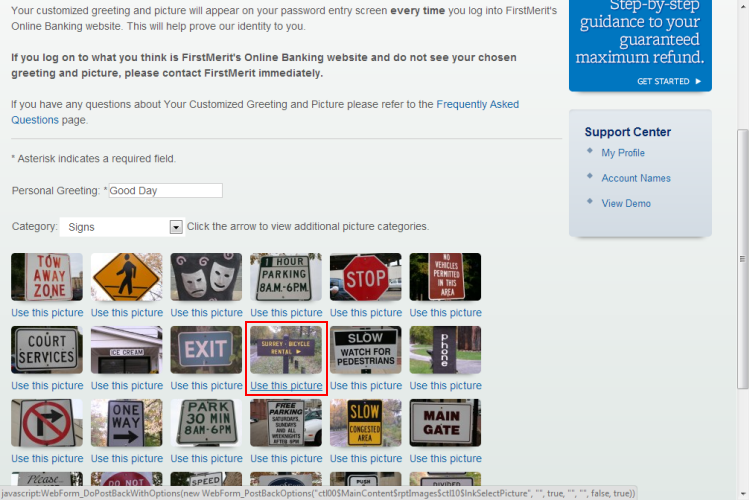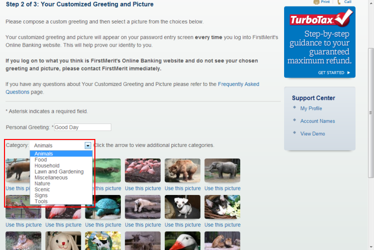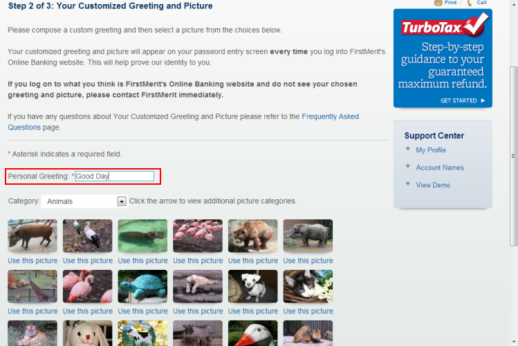 Step 2 of the enhanced login procedures asks you to compose a custom greeting and select a picture that will appear on your password entry screen every time you log into Moltrina Offshore's Online Banking website. This will help prove our identity to you.