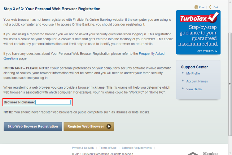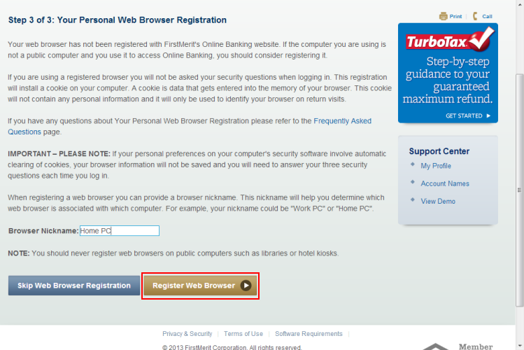 Step 3 of the enhanced login procedure asks you to register your personal web browser. If the computer you are using is not a public computer and you use it to access Online Banking, you should consider registering it.