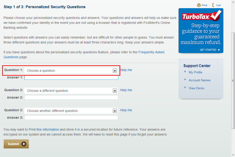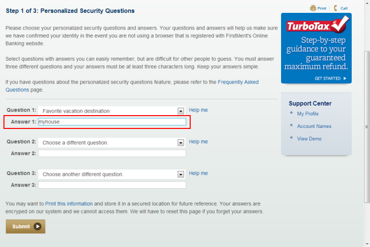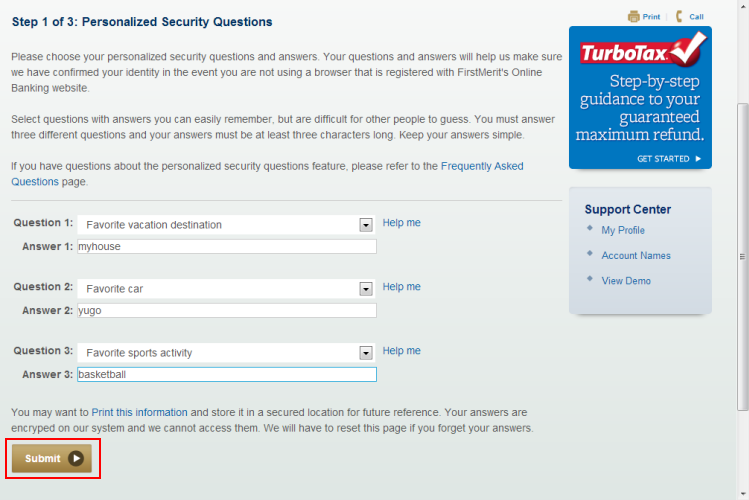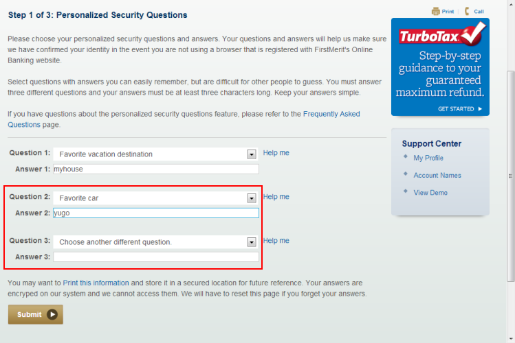 Once you've selected and answered all three questions, press the "Enter" key on the keyboard or click the "Submit" button. Note: You may want to print this information and store it in a secured location for future reference. -