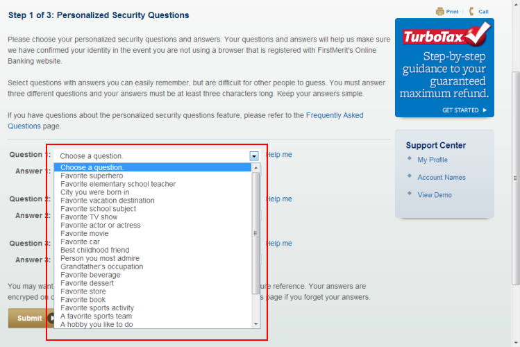 Now repeat the previous two steps for security questions two and three. Be sure to Choose different questions for each item. -